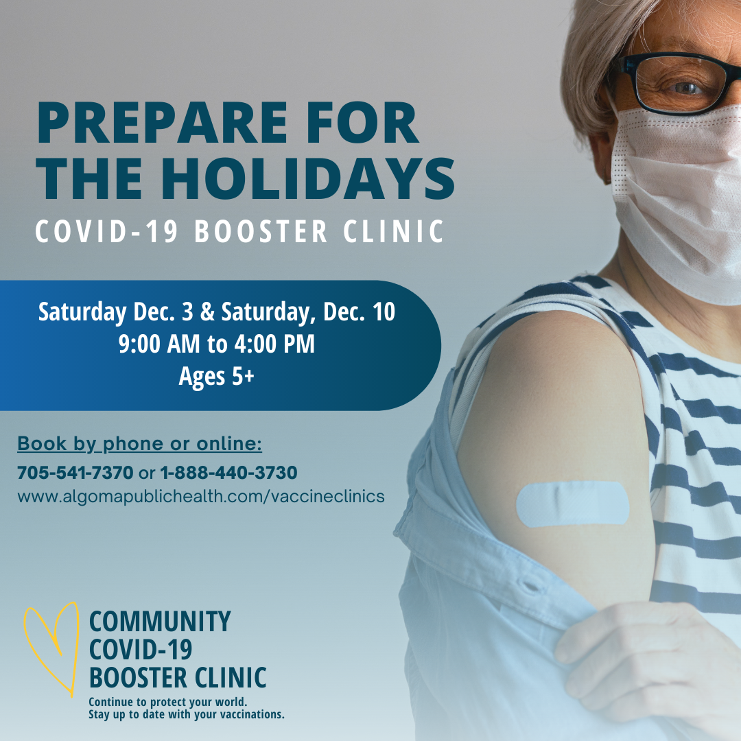 “Getting vaccinated is an important and effective layer of protection that can protect you from severe illness,” said Dr. John Tuinema, Acting Medical Officer of Health at Algoma Public Health. “It can take up to two weeks after vaccination before your immune system develops the full benefit from your booster dose. Booking an appointment as soon as you are eligible will help build that protection before the holidays.”